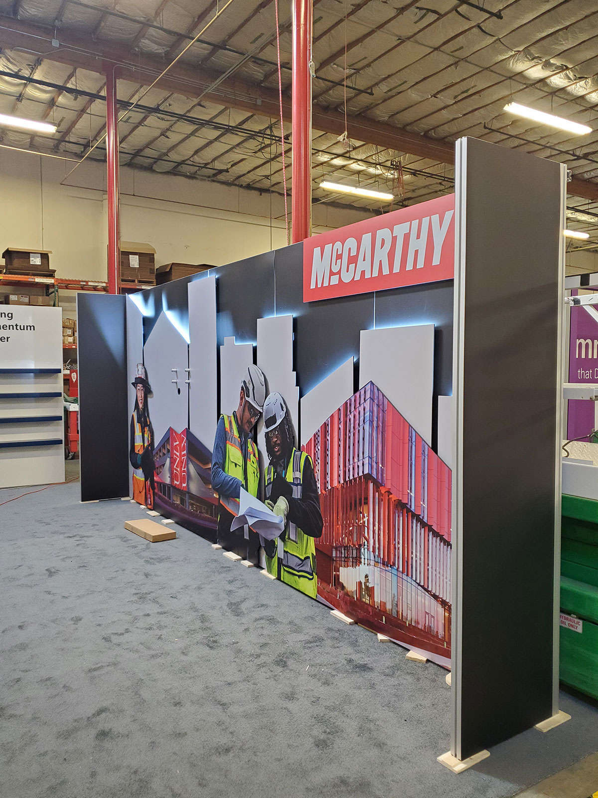 Modified ECO-2038 Sustainable Exhibit with Shelves, Locking Closet, Lightbox, SEG Fabric Graphics, Monitor Mount, and MOD-1590 Backlit Reception Counter with Locking Storage [ORD-69141]