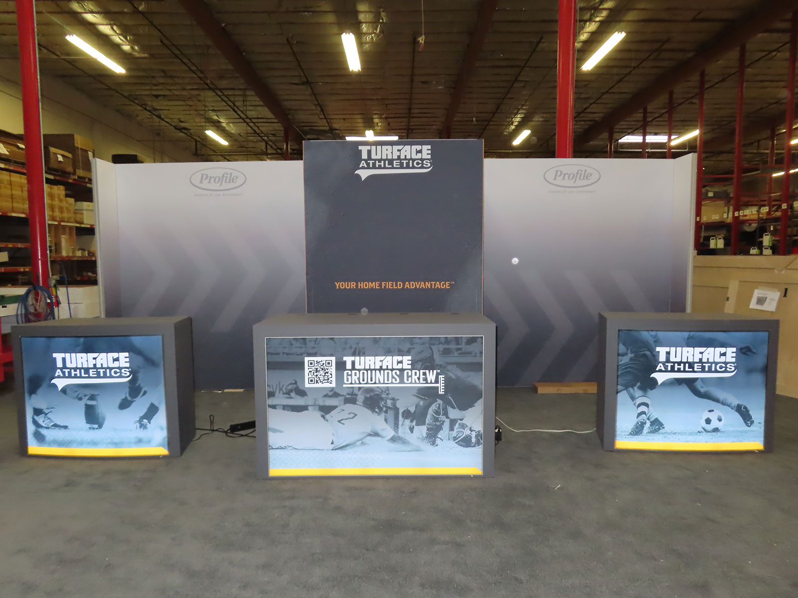 Custom Inline Exhibit with SuperNova Backlit Lightboxes, (4) Product Shelves, Storage Closet, Fabric and Direct Print Graphics, Reception Counter w/ Open Storage, and Counter w/ Locking Storage and Wireless Charging Pads [ORD-69079]